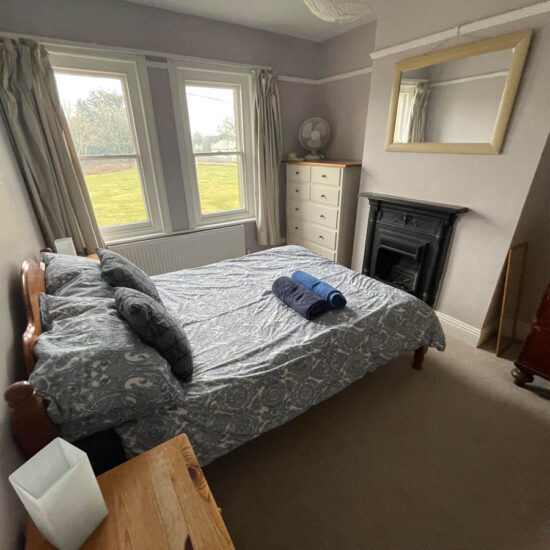 Charming front bedroom, with pine double bed, feature fireplace and ample space with wardrobes. The master bedroom has views towards open forest.